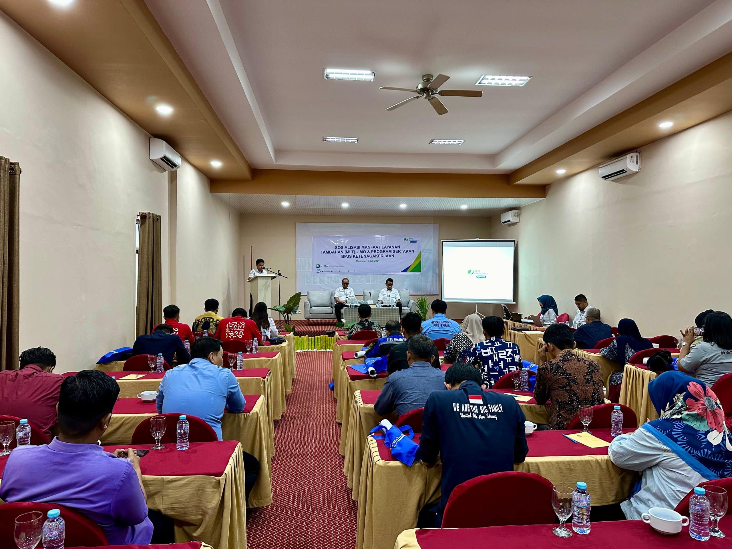 Turut hadir sebagai narasumber dalam sosialisasi ini pihak Bank Tabungan Negara (BTN) Mamuju yang menjelaskan tentang tatacara dan benefit program MLT bagi peserta BPJS Ketenagakerjaan.