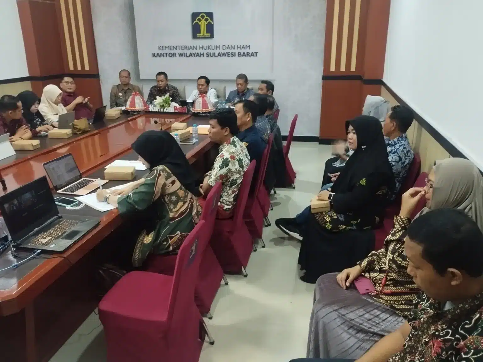 Rapat ini dipimpin oleh Kepala Kanwil Kemenkumham Sulbar, Sunu Tedy Maranto. Turut hadir dalam pertemuan ini Kepala Biro Hukum Aprisal, Kepala Divisi Kemenkumham Sulbar John Batara, serta Tim perancang Perundang-undangan kemenkumham dan para perwakilan dari (OPD) terkait.